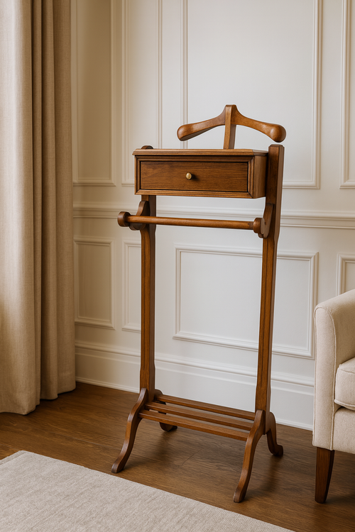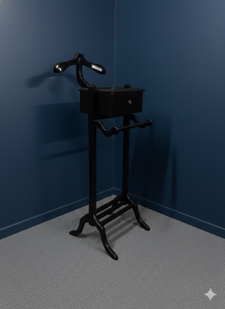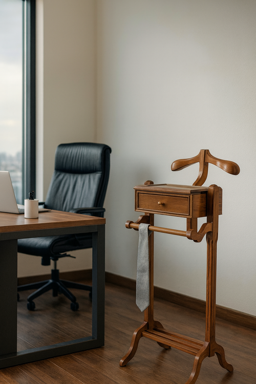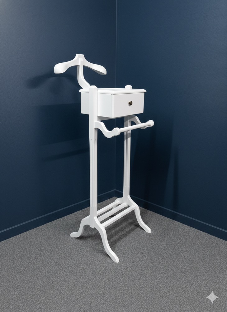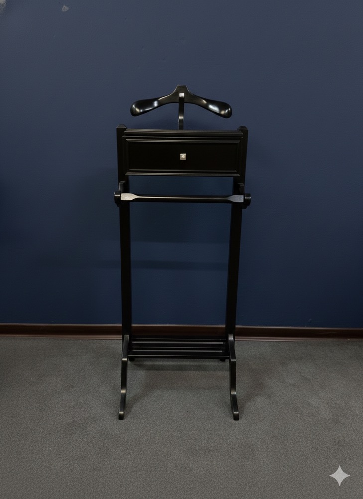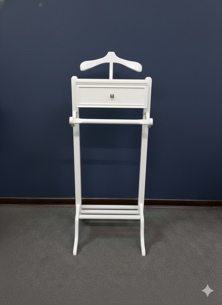 آویز کت و شلوار دارای یک کشو برای نگهداری وسایل شخصی میباشد دارای یک میله جهت نگهداری شال گردن و کروات میباشد. استفاده از چوب های نرده ای در پائین این استند کت امکان قراردادن کفش و دمپایی دارد. قسمت آویز اصلی آن دارای ارتفاع 120 سانت میباشد که امکان آویز کت و مانتو را دارد